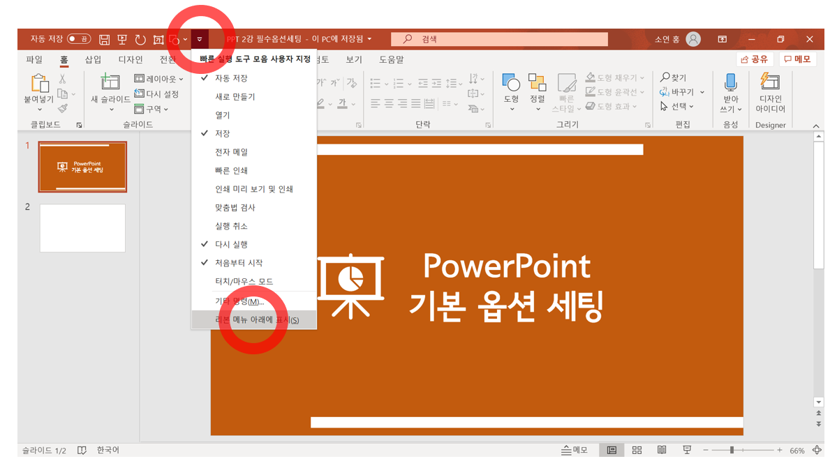 보통은 빠른 실행 도구 모음이 창의 왼쪽 위에 있다. 이를 리본 메뉴 아래에 표시한다.
