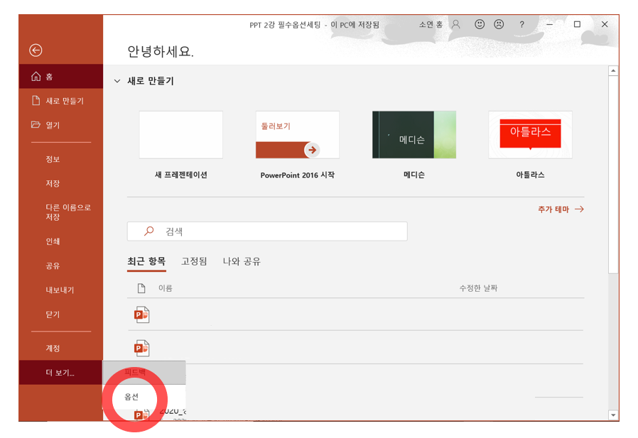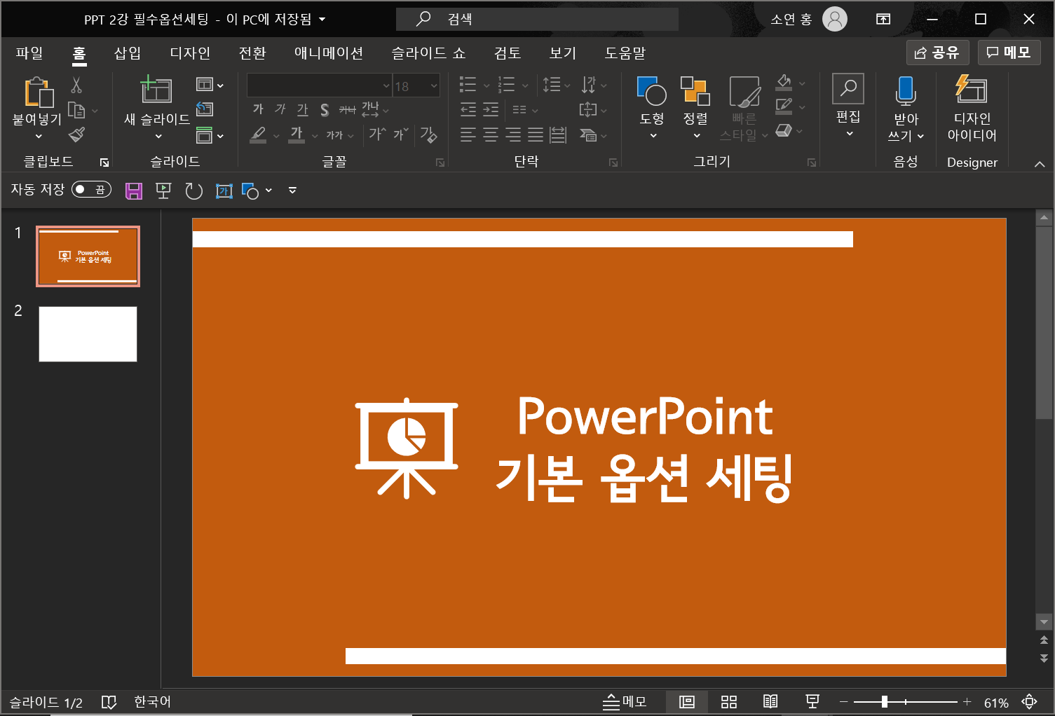 그 중에서 [일반] 탭에서 Office 테마를 변경할 수 있다. 영구 설정이라 변경 후 오른쪽 아래의 [확인]을 클릭하고 나면 이후 새 powerpoint 파일을 생성할 때마다 해당 테마가 적용된다.