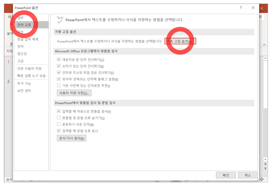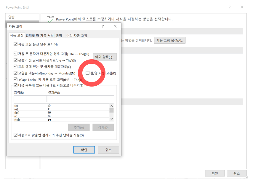 이럴 땐, 옵션 창에서 [언어 교정] -> [자동 고침 옵션] -> 한/영 자동고침(K) 체크 해제 해준다.