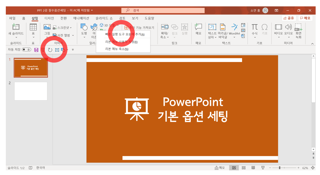 빠른 실행 도구 모음에 추가하고자 하는 기능이 있으면 [마우스 오른쪽 클릭]하여 [빠른 실행 도구 모음에 추가] 하면 된다.