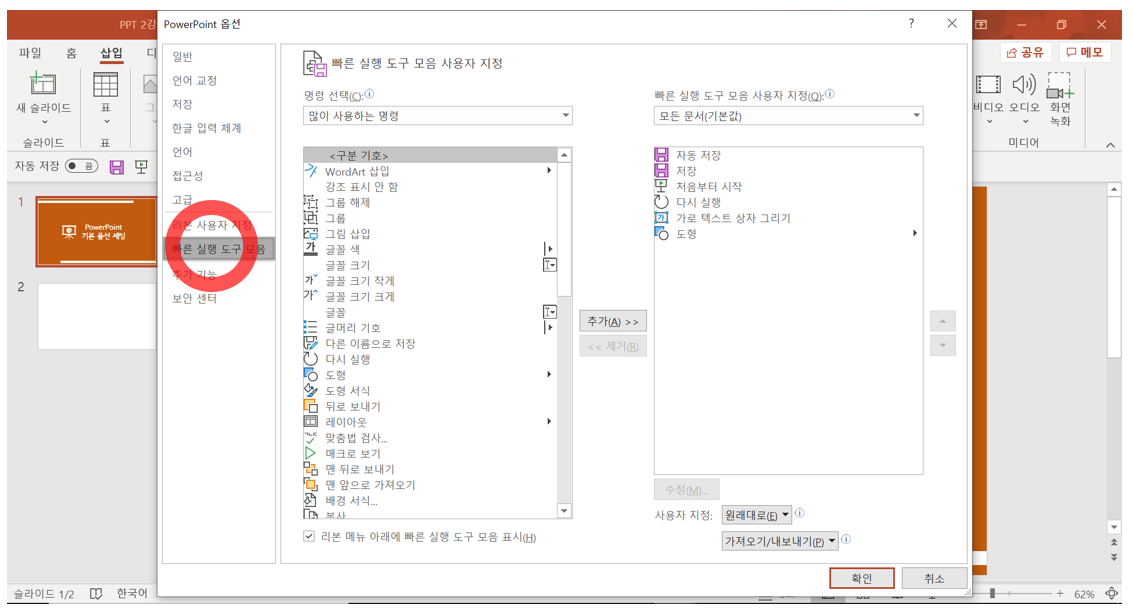 또는 옵션 창에서 [빠른 실행 도구 모음] 탭에서 직접 추가 및 제거할 수 있다.