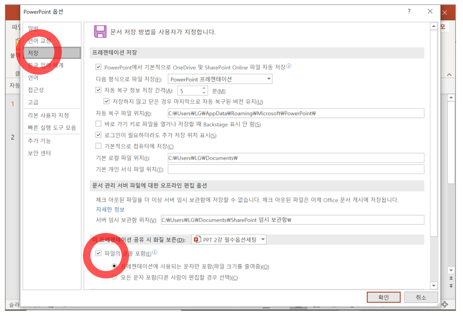 옵션 창에서 [저장] -> [파일의 글꼴 포함]을 선택하고 확인을 누른다.
